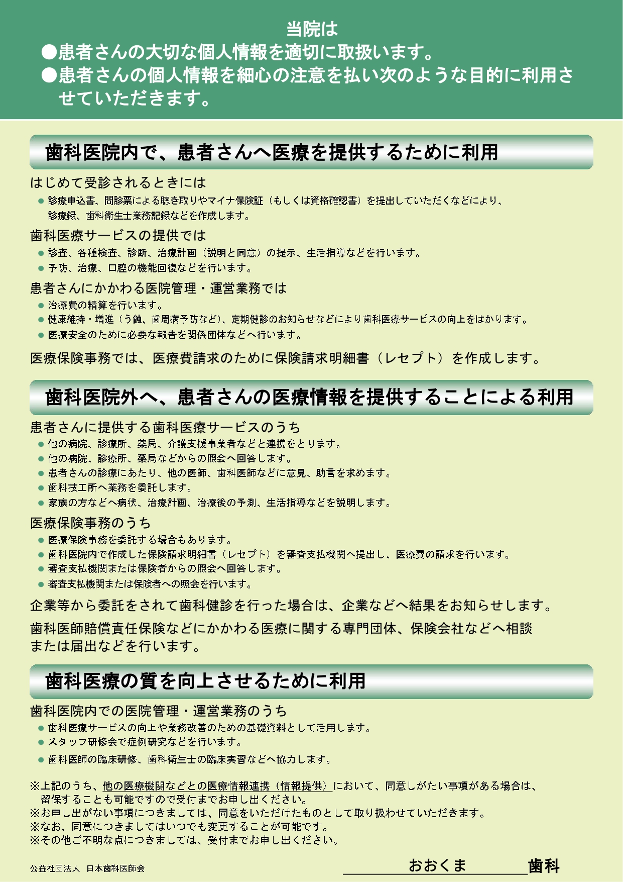 問診票、診療録、検査記録、エックス線写真、歯型、処方せん等の「個人情報」は、別掲の利用目的以外には使用しません。