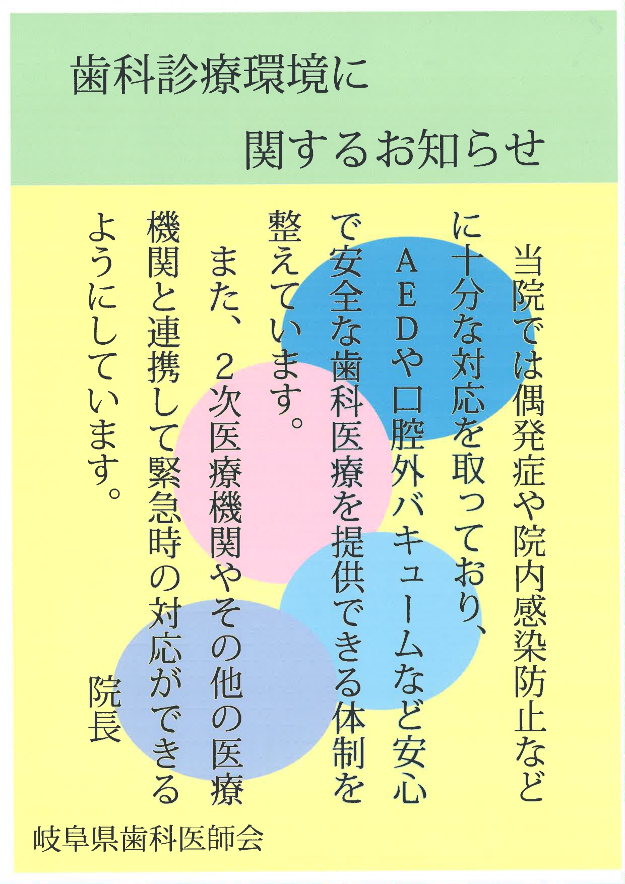 歯科外来診療における院内感染防止対策に十分な体制の整備、十分な機器を有し、研修を受けた常勤の歯科医師及びスタッフがおります。